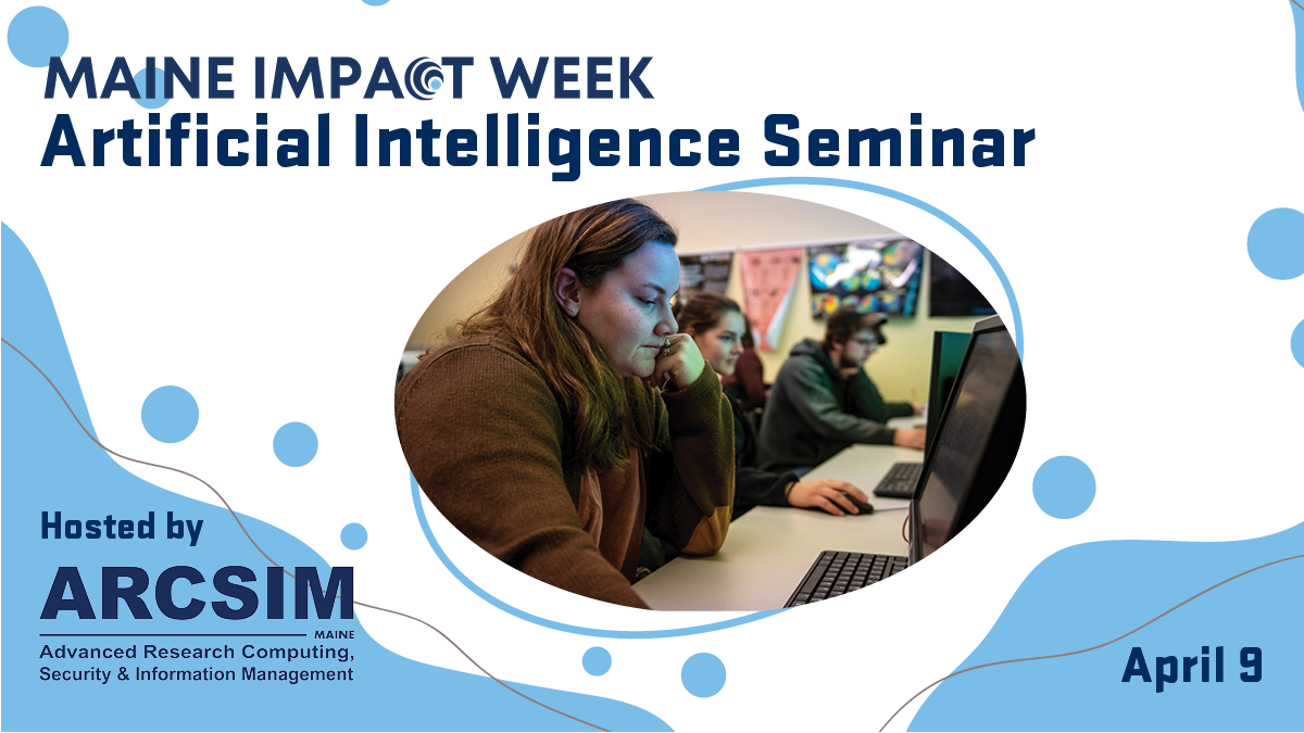 The Artificial Intelligence Seminar is hosted by the University of Maine System’s Advanced Research Computing, Security, and Information Management (ARCSIM) unit. The event is a part of Maine Impact Week, an annual showcase of UMaine’s impact on the state and beyond. It is hosted by the Office of the Vice President for Research and Dean of the Graduate School.